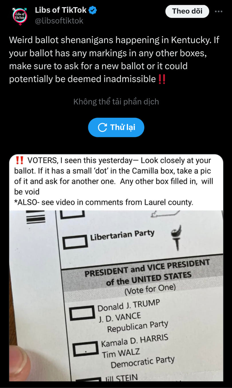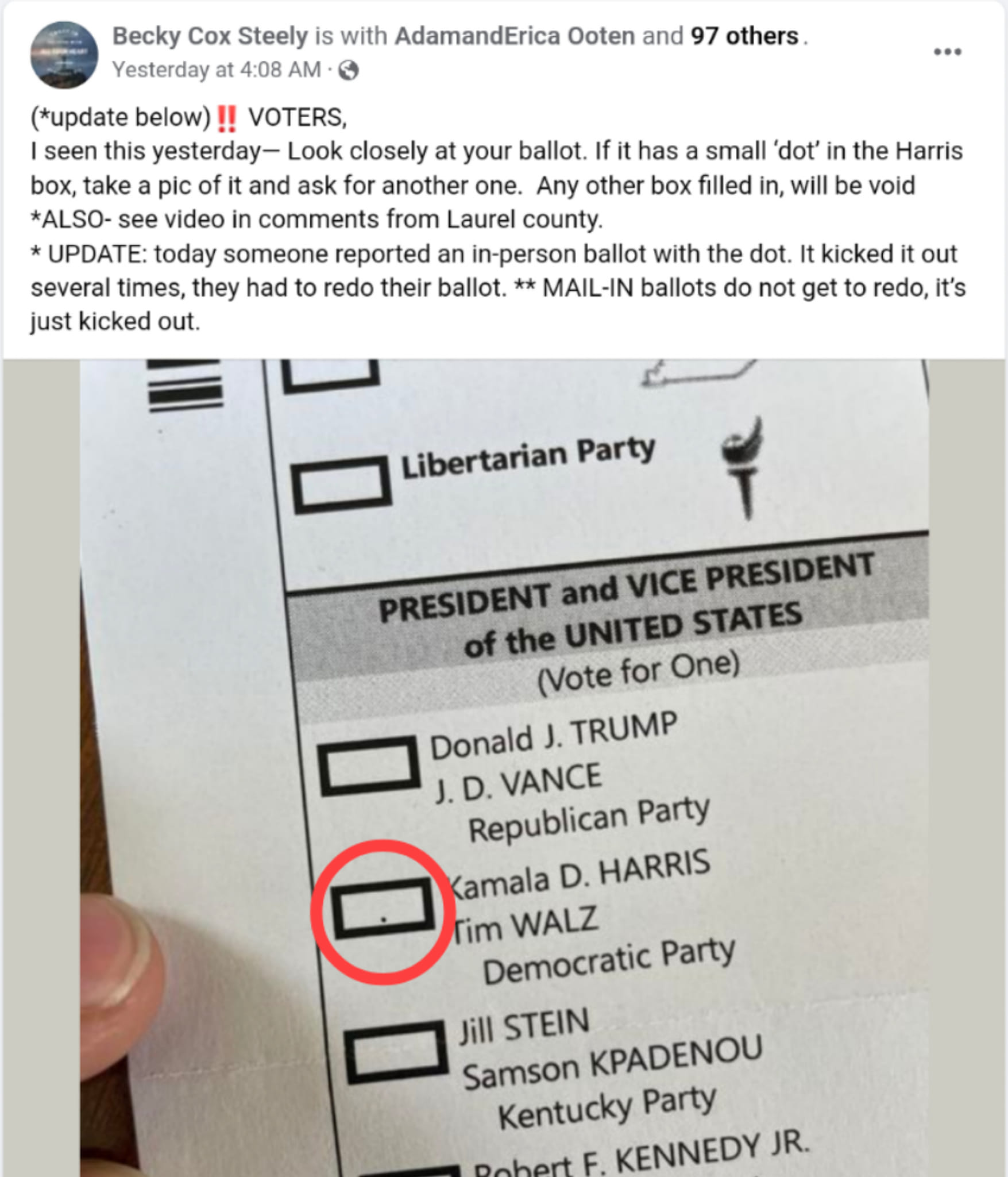 tôi đã thấy điều này ngày hôm qua-- Hãy xem kỹ lá phiếu của bạn. Nếu có một 'chấm' nhỏ trong ô Harris, hãy chụp ảnh nó và yêu cầu một lá phiếu khác. Bất kỳ ô nào khác được điền vào sẽ bị vô hiệu NHƯ VẬY*