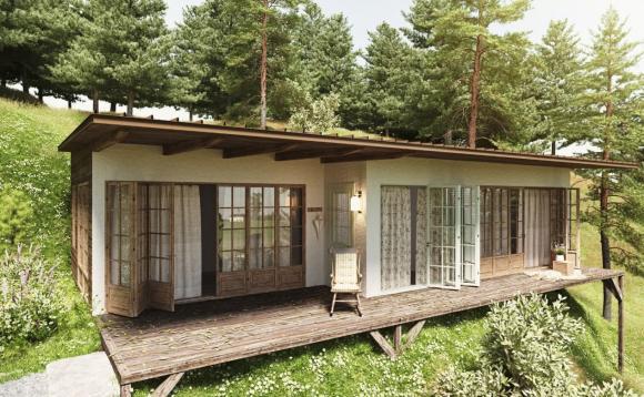 Căn nhà gỗ vào ban đêm sáng ánh đèn trông vừa lãng mạn vừa bí ẩn.