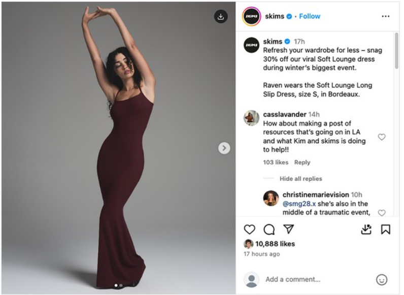 Skims bị chỉ trích vì đăng bài quảng cáo sản phẩm giữa lúc cháy rừng gây thiệt hại lớn cho Los Angeles. Ảnh: IG.