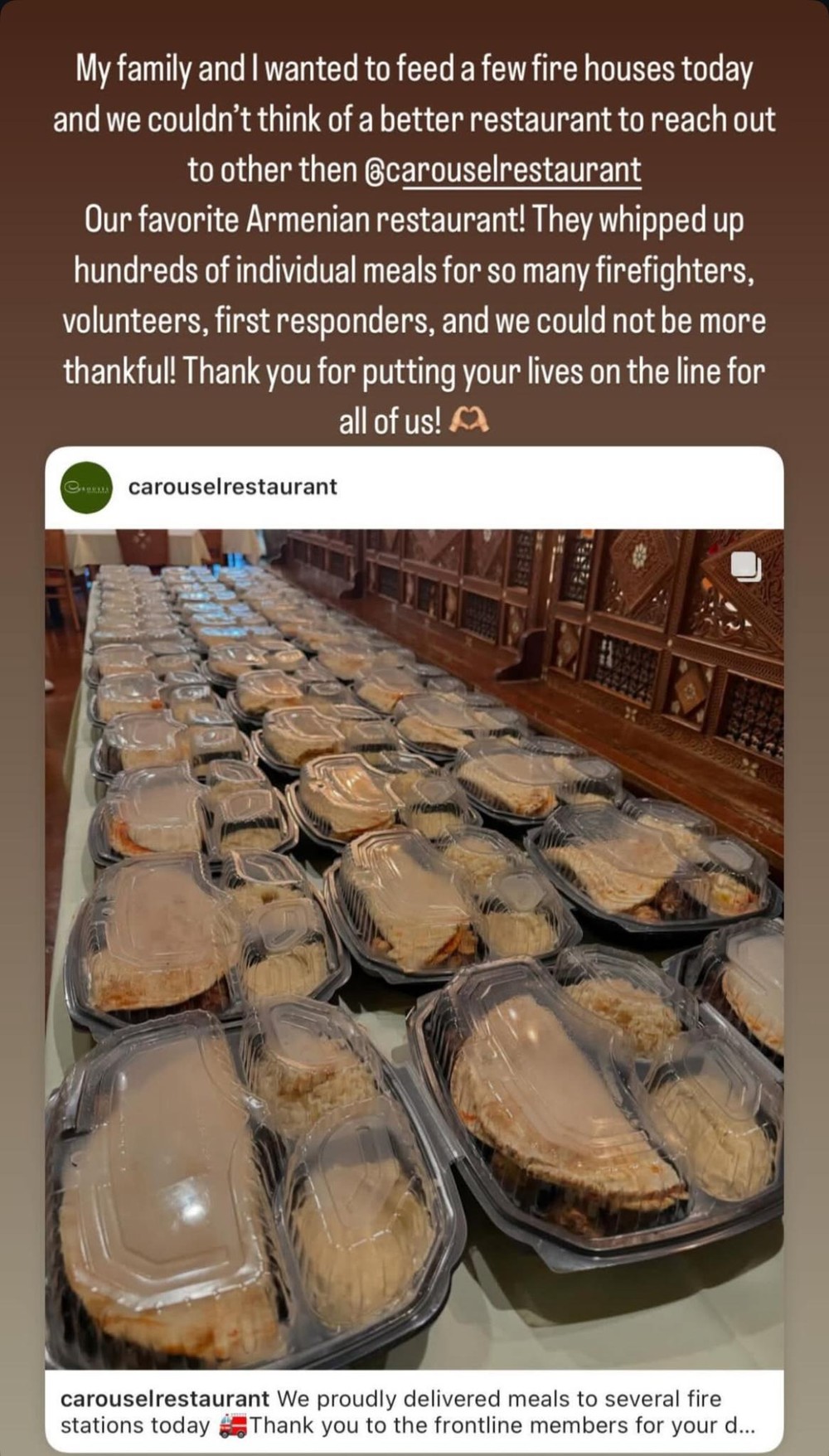 Gia đình Kardashians tặng hàng trăm suất cơm trị giá 2.500 USD cho lính cứu hỏa. Ảnh: IG.