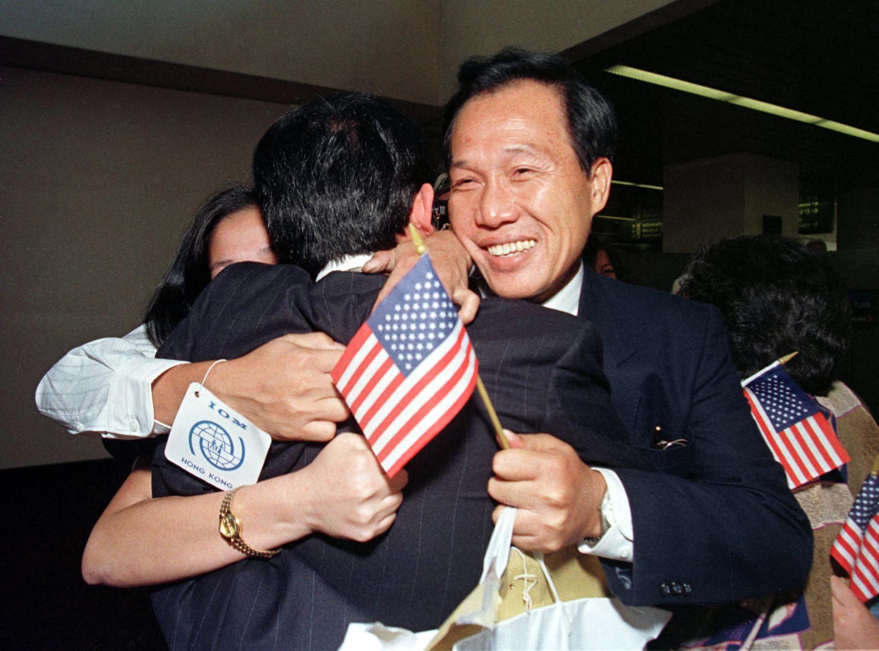 Một trong những người tỵ nạn Việt Nam cuối cùng rời "trại cấm" ở Hong Kong đến San Francisco, Mỹ, ngày 19 tháng Sáu 1997 khi trại tỵ nạn này bị đóng cửa. (Ảnh: Monica Davey/AFP/Getty Images)