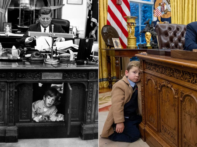 John F. Kennedy Jr. lúc nhỏ (trái) hồi năm 1962 và X (phải) tại Phòng Bầu dục năm 2025.