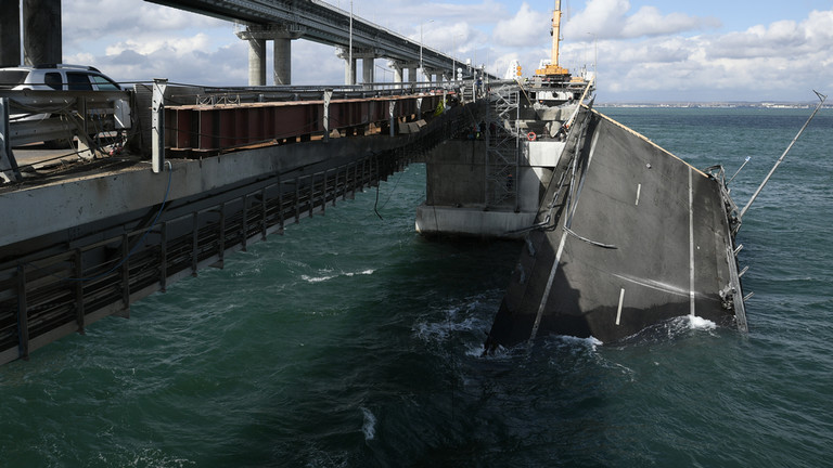 Cây cầu Crimea sau khi bị tấn công bằng xe cài bom vào tháng 10/2022. Ảnh: Sputnik