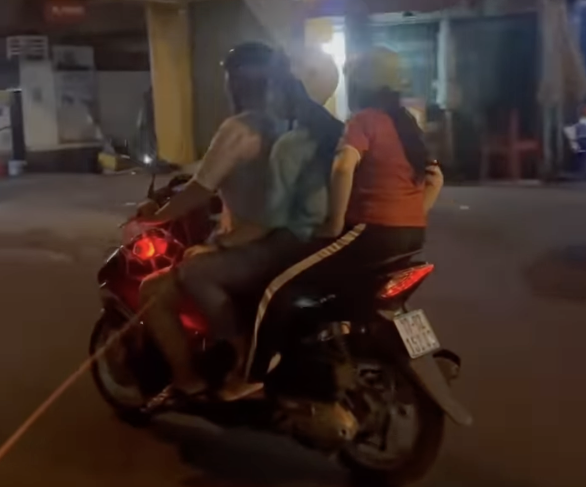 Ba người đi xe gắn máy lượm drone bị rơi và đem về nhà. (Hình: Chụp qua màn hình)
