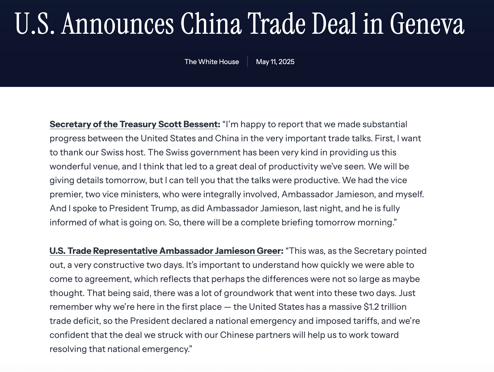 Nhà Trắng vào Chủ nhật (11/5) đã công bố một “thỏa thuận thương mại” với Trung Quốc, nhưng không cung cấp thông tin cụ thể, sau khi các quan chức chính quyền Trump đã dành cả cuối tuần để đàm phán với phía Trung Quốc.