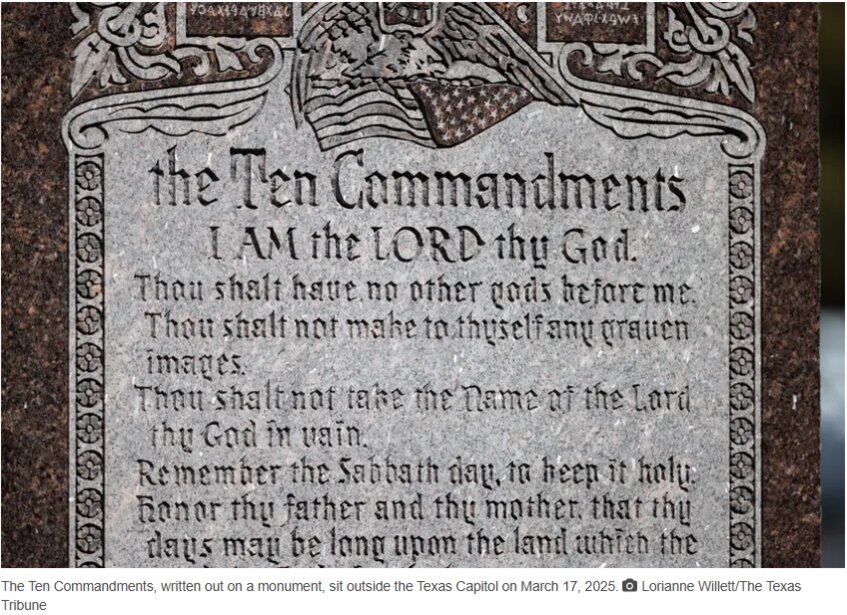 Đến tháng 9, mọi lớp học trường công ở Texas có thể phải trưng bày Mười Điều Răn theo yêu cầu đã thông qua một cuộc bỏ phiếu quan trọng tại cơ quan lập pháp Texas vào Chủ Nhật — một phần trong nỗ lực lớn hơn ở Texas và nhiều nơi khác nhằm tăng cường vai trò của tôn giáo trong trường học.