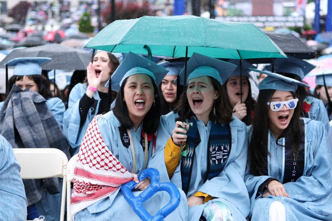 Sinh viên Đại học Columbia, New York, dự lễ tốt nghiệp giữa trời mưa ngày 21/5. Ảnh: AP