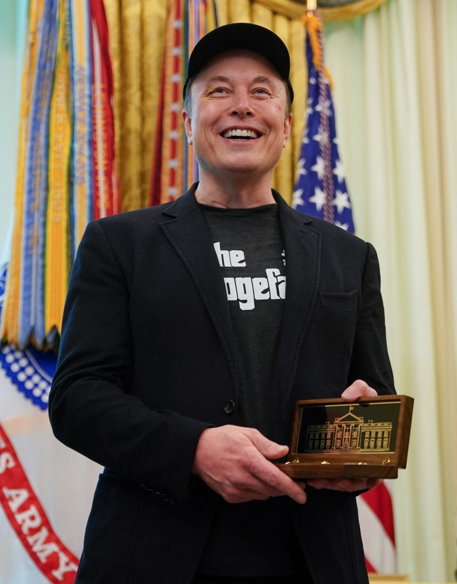 Elon Musk tham dự cuộc họp báo với Tổng thống Donald Trump tại Phòng Bầu dục, Nhà Trắng, hôm 30/5. Ông xuất hiện trong cả "cây" đen với áo phông, vest, quần jeans, giày Tây và mũ lưỡi trai. Ảnh: AFP