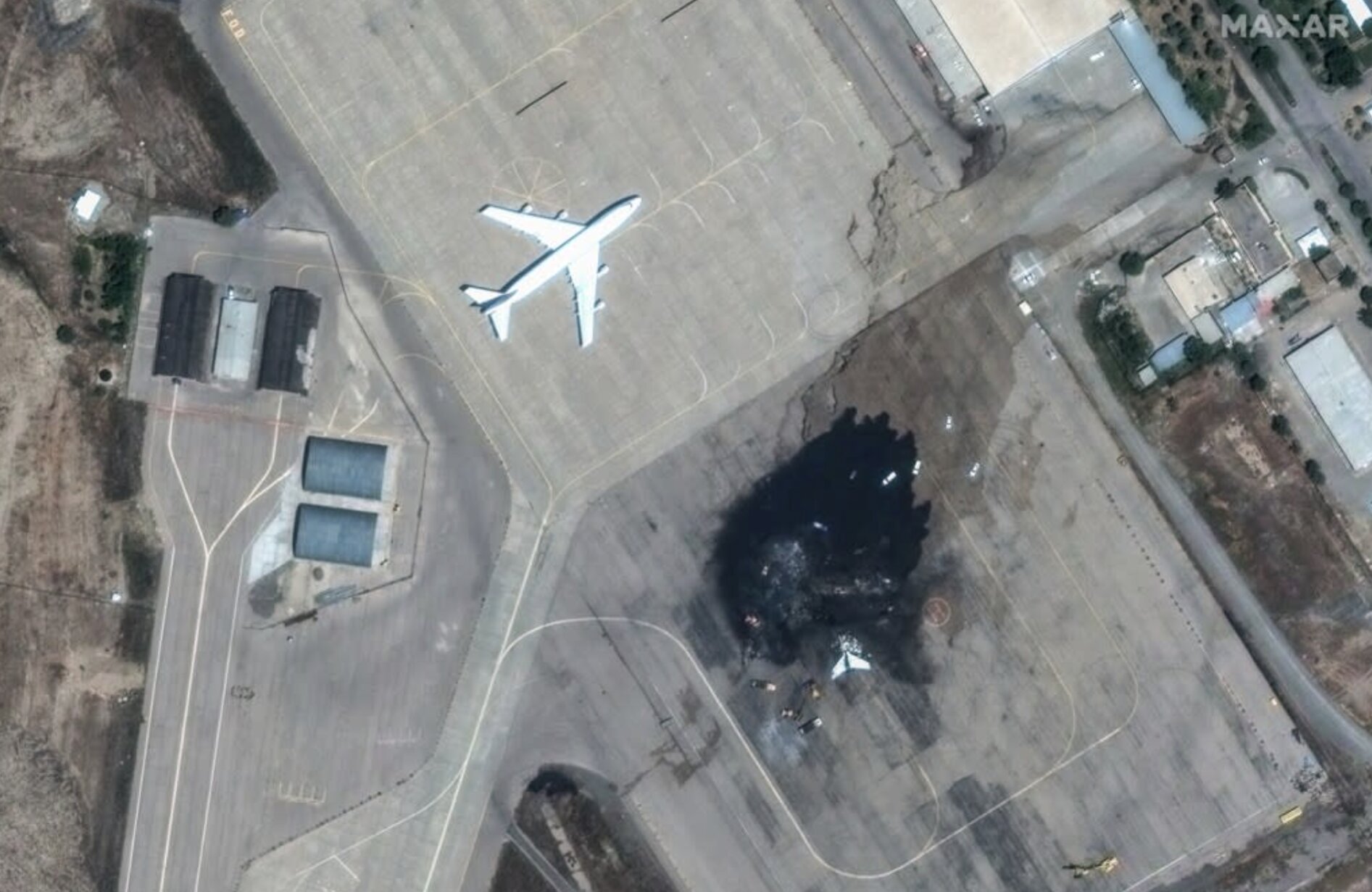 Hình ảnh từ vệ tinh cho thấy tàn tích chiếc máy bay tiếp tế nhiên liệu trên không KC-707 của Không quân Iran sau cuộc tấn công của Israel hôm 17/6. (Ảnh: Maxar Technologies)