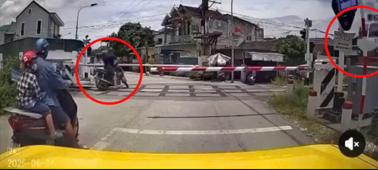 Gác chắn đã hạ, đèn đỏ đoạn qua đường sắt đã bật lên báo hiệu tàu hỏa sắp chạy qua, song người đàn ông đi xe máy vẫn cố vượt qua.