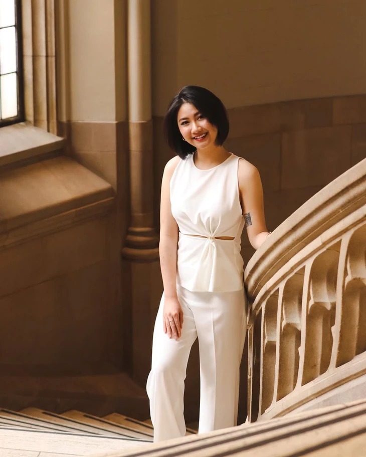 Phương Linh có hình xăm nhỏ trên cánh tay trái trong bức ảnh chụp năm 2022. Cô nói hình xăm nhắc nhở bản thân biết trân trọng cuộc sống hơn, xuất phát từ giai đoạn khủng hoảng tâm lý khi du học Mỹ.