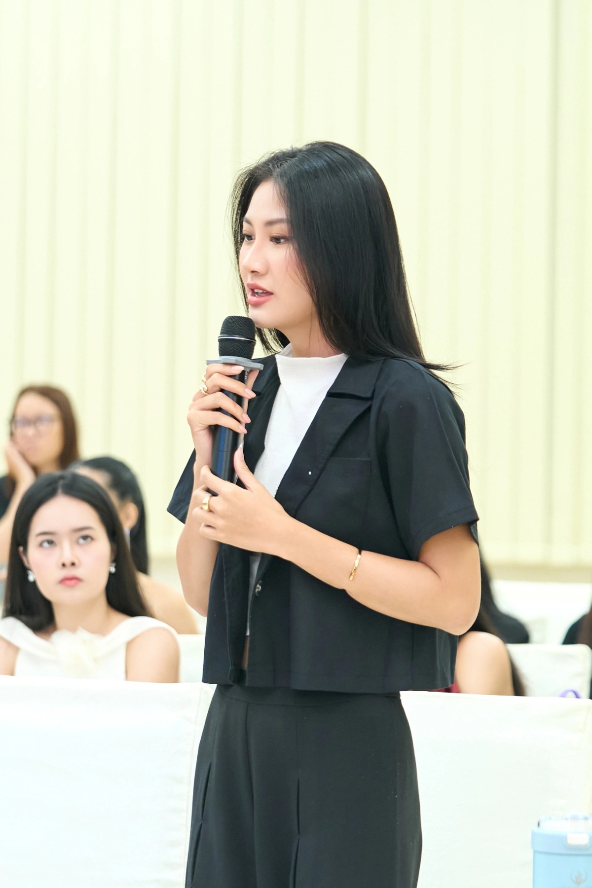 Tại cuộc thi, Phương Linh nhiều lần chọn trang phục thoải mái khi tham gia hoạt động bên lề. Cô phối crop top, áo khoác lửng tại một hoạt động của trại huấn luyện Cosmo Camp.