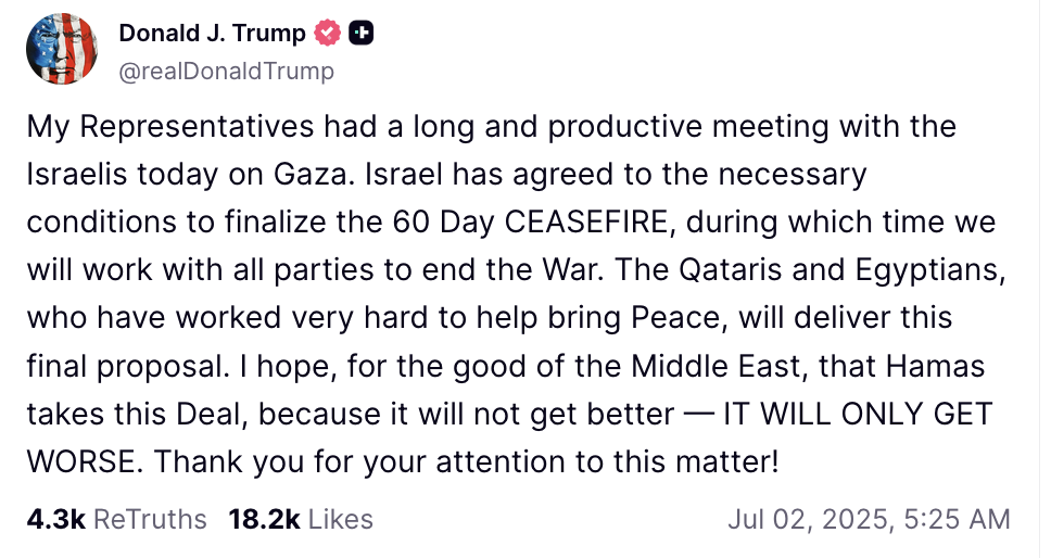 Cảnh báo cứng rắn của Tổng thống Mỹ Donald Trump đối với Hamas được đưa ra trên nền tảng mạng xã hội Truth Social vào dáng 2/7/2025. Ảnh chụp màn hình