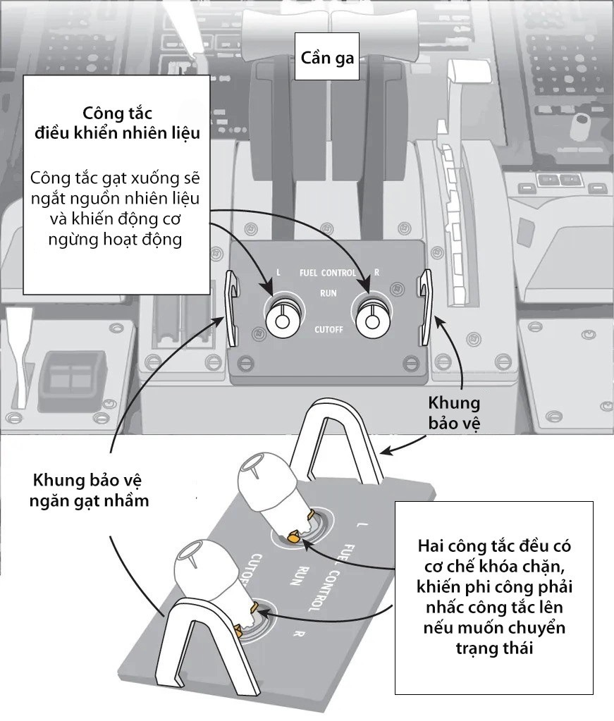 Vị trí công tắc điều khiển nhiên liệu trên máy bay Boeing 787. Đồ họa: Seattle Times