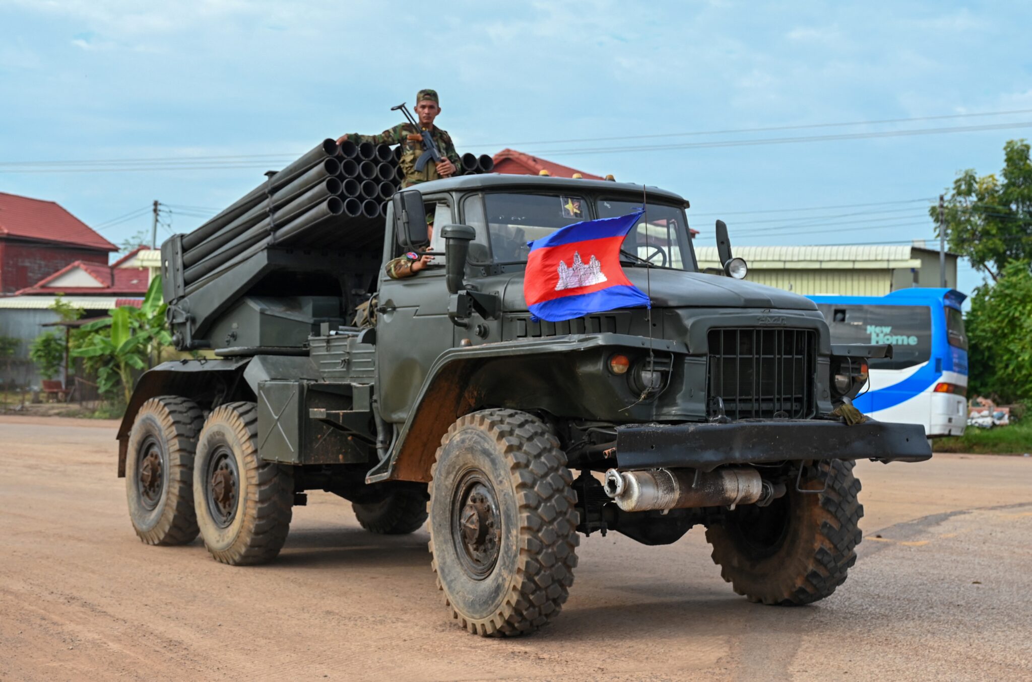 Lính Cambodia đứng trên chiếc quân xa có trang bị dàn phóng hỏa tiễn BM-21 của Nga chạy ngoài đường ở tỉnh Oddar Meanchey hôm 25/7. (Ảnh: Tang Chhin Sothy/AFP via Getty Images)
