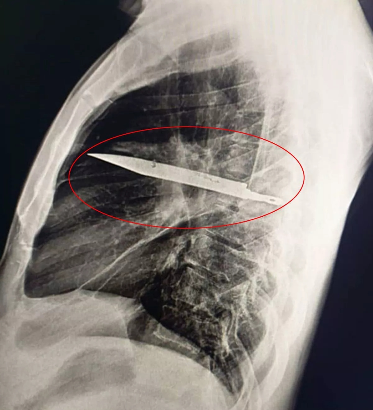 Cuộc sống của anh "bình yên vô sự" kể từ đó, theo lời bệnh nhân, cho đến khi anh ấy nhận thấy mủ chảy ra từ dưới núm vú. Và rồi thật khó tin, một phim chụp X-quang ngực đã tìm ra nguyên nhân gây ra căn bệnh hiện tại của người đàn ông - một lưỡi dao lớn găm vào giữa ngực. Các bác sĩ có thể thấy con dao đã đâm xuyên qua xương bả vai phải và tránh được các cơ quan quan trọng.