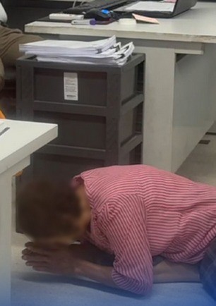 Người phụ nữ quỳ gối, dập đầu xin tha thứ trước mặt vị sư già. Ảnh: Channel 7