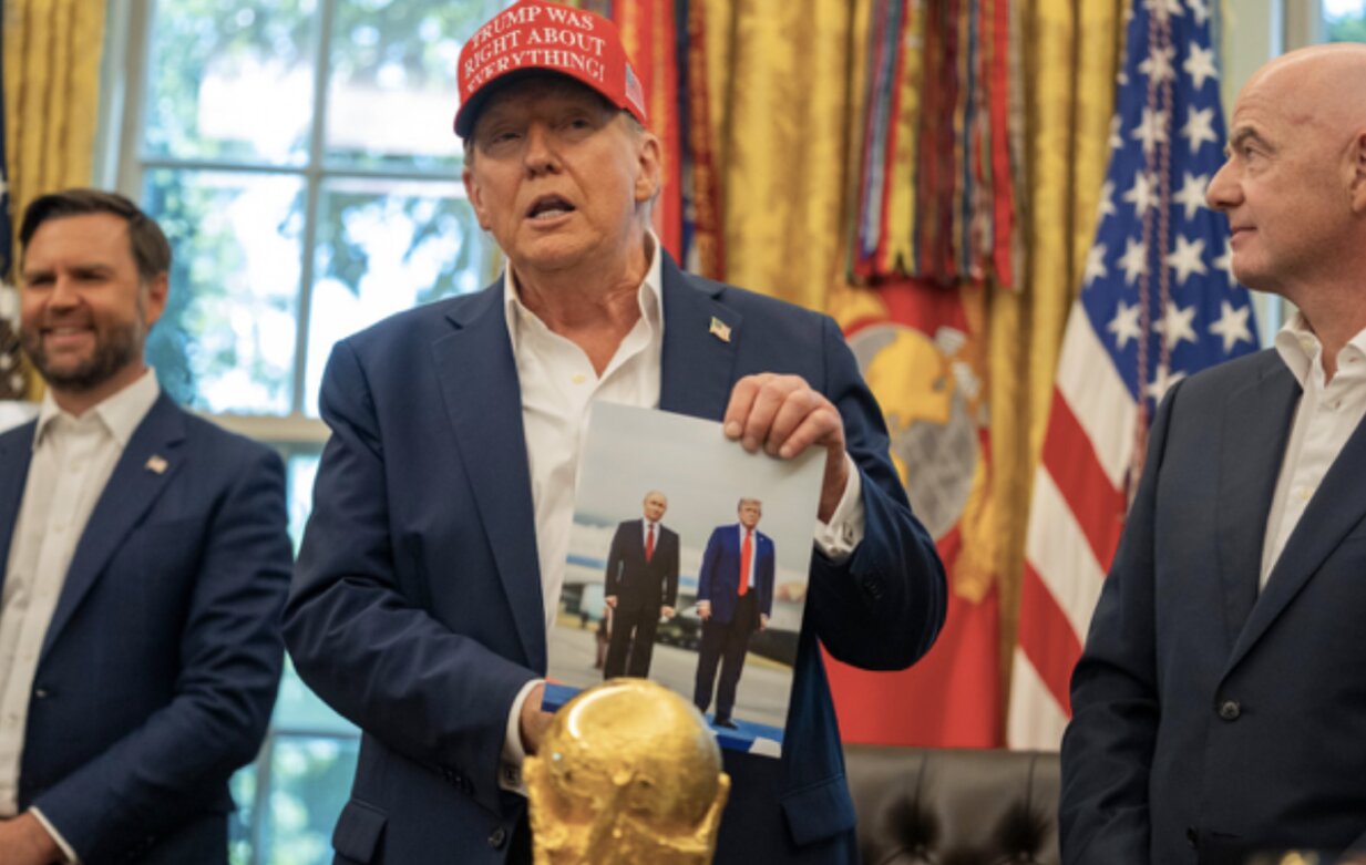 Ông giơ cao bức ảnh chụp ông đứng cạnh tổng thống Nga tại Anchorage mà ông nói rằng Tổng thống Putin đã gửi cho ông. Ông gợi ý rằng có khả năng ông Putin sẽ tham dự World Cup mà Mỹ sẽ đăng cai năm 2026.