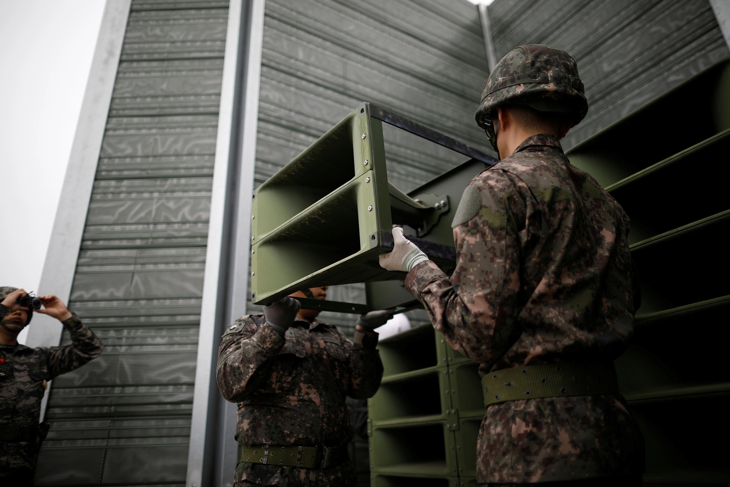 Loa phát thanh gần khu phi quân sự ngăn cách hai miền Triều Tiên hồi năm 2018. Ảnh: Reuters