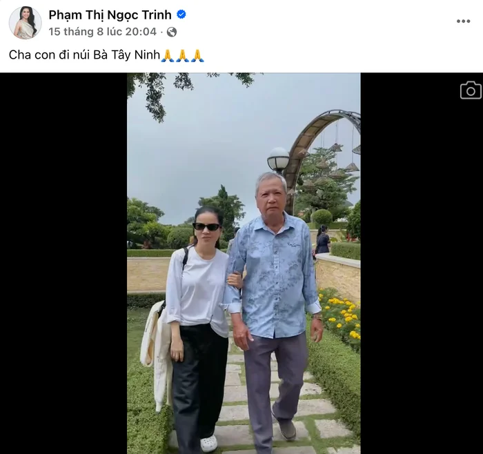 Cụ thể, ngoài thông báo cáo phó vừa được chia sẻ, bài đăng cuối cùng của Ngọc Trinh là một đoạn clip vui vẻ cùng bạn bè hôm 18/8. Trước đó hôm 15/8, cô chia sẻ khoảnh khắc du lịch cùng đấng sinh thần, viết trên trang cá nhân: "Cha con đi núi Bà Tây Ninh".