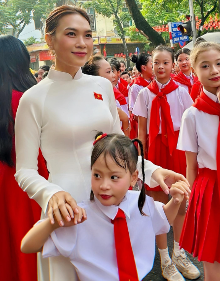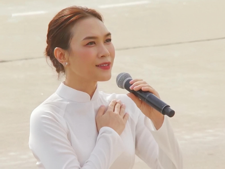 Không diện trang phục cầu kỳ, Mỹ Tâm chọn áo dài trắng tinh khôi, ôm dáng thanh thoát, điểm xuyết chiếc huy hiệu cờ đỏ sao vàng trang trọng. Tóc búi gọn sau gáy, gương mặt trang điểm nhẹ nhàng với đôi mắt sáng và bờ môi hồng tự nhiên, mang đến tổng thể vừa giản dị, vừa sang trọng.