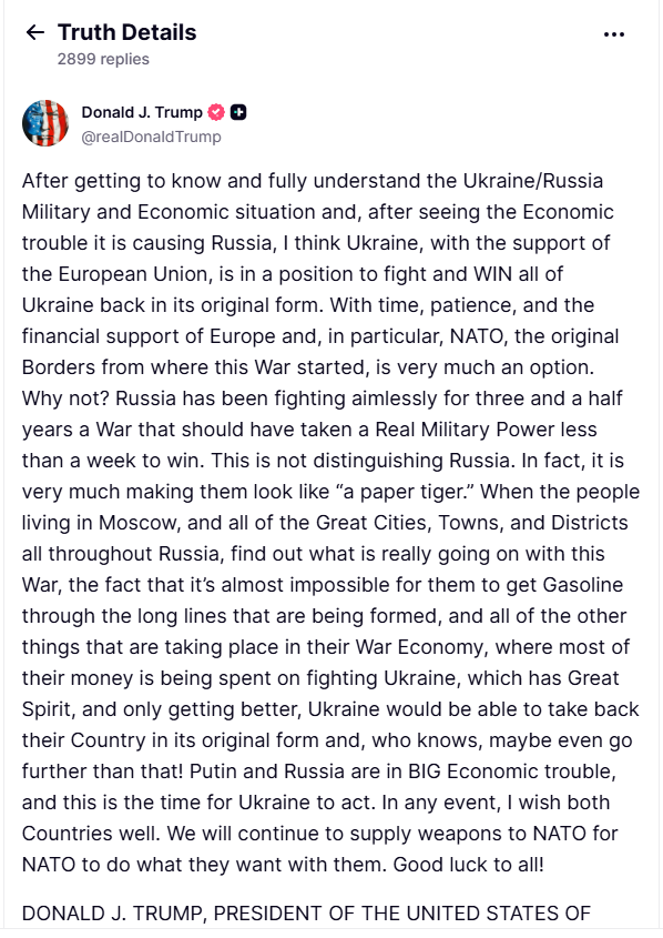 “Sau khi tìm hiểu và hiểu rõ tình hình quân sự và kinh tế Ukraine/Nga, cũng như chứng kiến ​​những khó khăn kinh tế mà điều này gây ra cho Nga, tôi nghĩ Ukraine, với sự hỗ trợ của Liên minh Châu Âu, đang ở vị thế có thể chiến đấu và giành lại toàn bộ Ukraine về hình thái ban đầu,” ông Trump viết trên Truth Social sau cuộc gặp với tổng thống Ukraine.