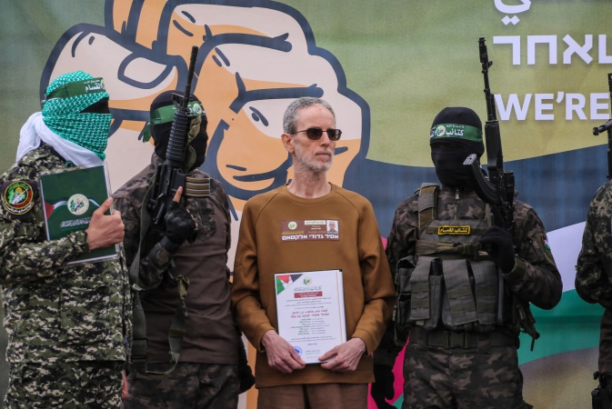 Hamas bàn giao một con tin cho Hội Chữ thập Đỏ ở Deir el-Balah, miền trung Gaza ngày 8/2. Ảnh: AFP