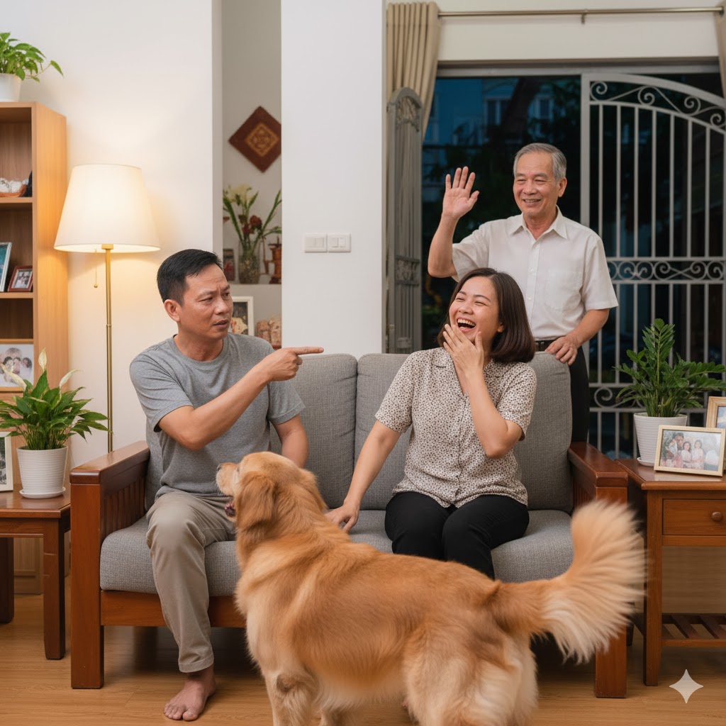 Bà vợ ôm bụng cười ngặt nghẽo, còn ông thì lẩm bẩm: