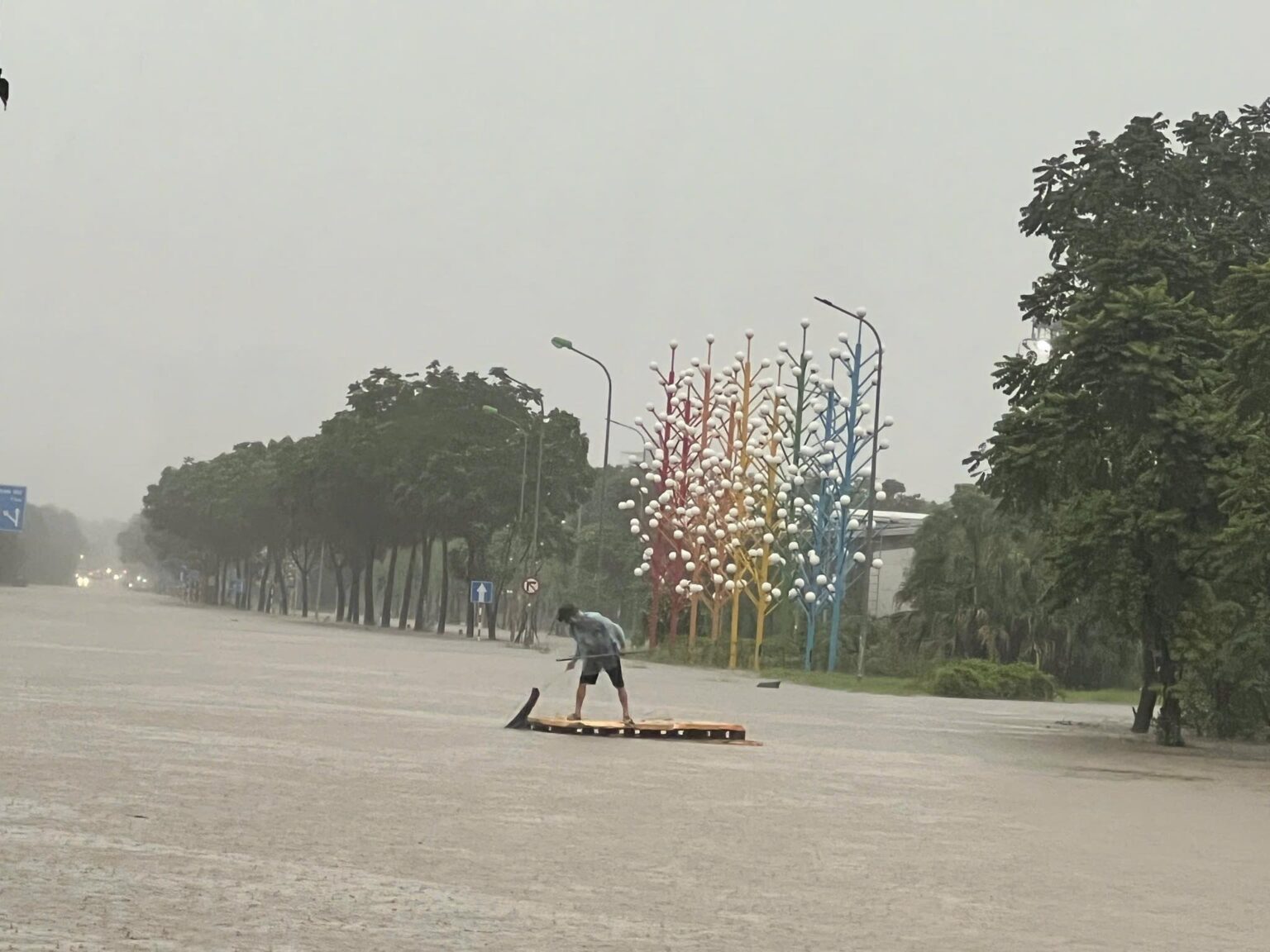 Người dân giống như đang bơi trong dòng nước ngập mênh mông như sông ở quảng trường trước sân vận động Mỹ Đình, Hà Nội. (Ảnh: Văn Ngọc/VNExpress)