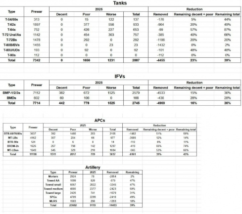 Nguồn dự trữ pháo binh cũng bị giảm sút - với pháo tự hành và pháo kéo cỡ lớn giảm gần một nửa. Theo đó, khoảng 23.602 khẩu pháo (bao gồm súng cối và pháo phòng không), khoảng 14.486 khẩu đã được nâng cấp và sử dụng, ước tính chỉ còn 39% còn trong kho dự trữ.