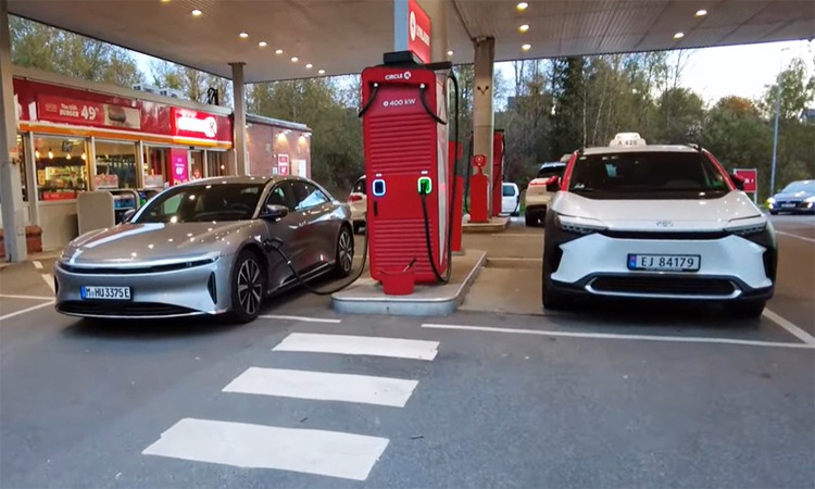 Một trạm nhiên liệu ở Na Uy, nơi vẫn có cột bơm xăng, nhưng phần lớn là trụ sạc xe điện. Hai xe phía trước là xe điện của Toyota (phải) và Lucid. Ảnh: Symply Gregster EV