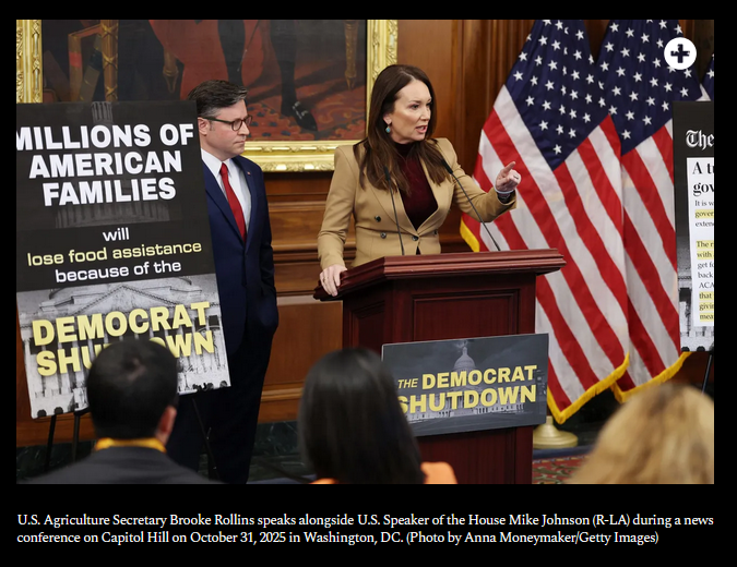 Bộ trưởng Nông nghiệp Hoa Kỳ Brooke Rollins phát biểu cùng Chủ tịch Hạ viện Hoa Kỳ Mike Johnson (Đảng Cộng hòa-LA) trong cuộc họp báo tại Đồi Capitol vào ngày 31 tháng 10 năm 2025 tại Washington, DC. (Ảnh: Anna Moneymaker/Getty Images)