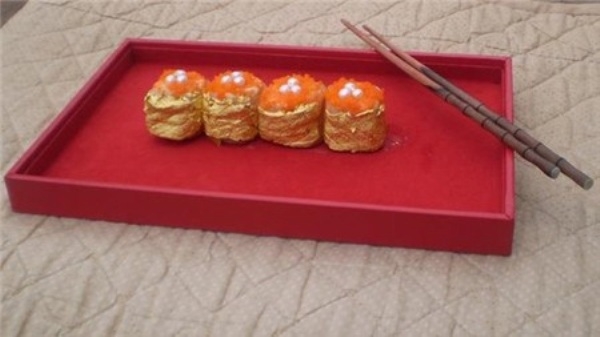 Sushi Del Oriente được cuốn bằng vàng lá 24K với năm viên kim cương châu Phi 0,2 carat trang trí ở phía trên. Món ăn này do đầu bếp nổi tiếng Angelito Araneta Jr của công ty ẩm thực cao cấp Karat Chef (Manila, Philippines) thực hiện và được bán với giá 85.727,59 peso Philippines (khoảng 45 triệu đồng).Sushi Del Oriente thường được đấng mày râu lựa chọn để làm quà cầu hôn. Quả thực nếu là cô gái may mắn được cầu hôn bằng món sushi này, chắn hẳn bạn khó có thể nói lời từ chối.