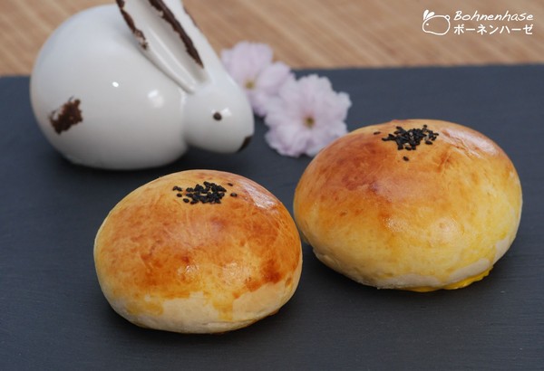 Phết lòng đỏ trứng và rải hạt mè đen lên trên mặt bánh và đem nướng 17 phút ở nhiệt độ 190 độ C là hoàn thành!