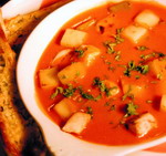 - Thịt gà không xương cắt thành miếng h́nh khối khoảng 1cm; Nước chanh tươi; Bột cà chua; Thịt xông khói cắt nhỏ; Hành tây - Cần tây - Ớát xanh - Cà chua bỏ hạt - Khoai tây bỏ vỏ tất cả cắt miếng h́nh khối khoảng 5mm; Ớt đỏ bỏ hạt xắt nhỏ; Rượu rum; Tỏi xắt nhỏ; Lá húng tây; Cành nguyệt quế; Nước sốt làm bằng hạt tiêu; Rau mùi xắt nhỏ; Nước dùng gà; Muối, bột tiêu; Dầu oliu.