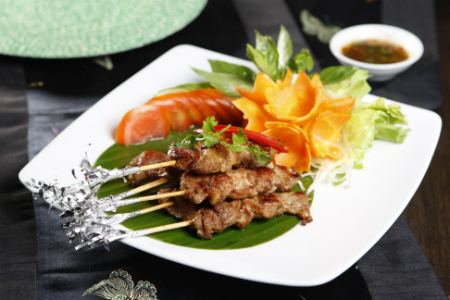 Xiên vào tăm tre nướng trên lửa than, thỉnh thoảng dùng cọ phết nước ướp lên thịt, trở đều đến lúc chín vàng. Cho các xiên thịt ra đĩa, trang trí với các loại rau, cà chua, dưa leo, cà rốt.