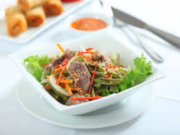 - Gỏi bò hoàng cung ăn với nước mắm chua ngọt và bánh phồng tôm.