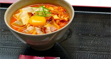 - Xếp mì, kim chi, đậu hủ non, thịt xá xíu ra tô.