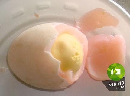 Dùng dao sạch bổ đôi quả trứng, bên trong hoàn toàn bình thường. Còn khi dùng giấy sạch thấm nước lọc, chấm vào bề mặt thì màu đỏ này thấm vào giấy và phai dần và biến mất sau vài lần lau, màu sắc quả trứng trở thành bình thường.