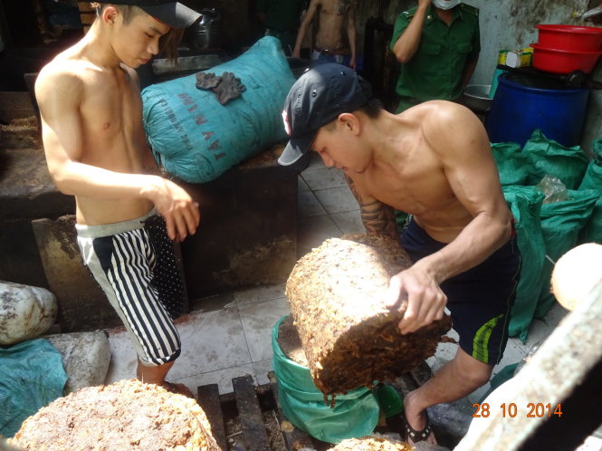 Một công đoạn sản xuất dầu ăn bẩn. Mỡ, da heo thối được đổ thẳng vào nồi lớn nấu trong vòng 4 giờ, sau đó cho vào khuôn thép ép trong vòng 1 giờ để cho ra thành phẩm dầu bẩn - Ảnh: Hoàng Lộc