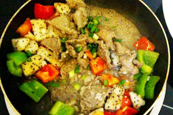 Vị thịt bò đậm đà kết hợp với ớt chuông thơm hăng, cùng vị chua thanh của những miếng thanh long hai da giòn sừn sựt làm nên một món ngon lạ miệng cho ngày đầu tuần.