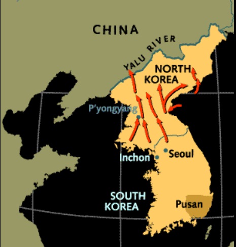 Sau khi tướng MacArthur dẫn quân đánh sang vĩ tuyến 38, đẩy quân đội Triều Tiên đến sông Áp Lục, giáp biên giới Trung Quốc. Bắc Kinh can thiệp gây thiệt hại nặng cho quân đội Liên Hợp Quốc.