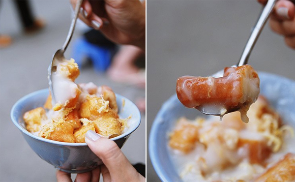 Bát cháo nóng, nhỏ xinh, nằm gần như gọn trong lòng bàn tay sẽ không khiến bạn quá no mà bỏ qua bữa tối. Cháo xay nhuyễn mịn màng, màu trắng sữa, vị mềm mại, ngọt từ nước xương hay nước luộc trai, ăn cùng quẩy cắt nhỏ được nhiều chị em lựa chọn cho bữa xế chiều.
