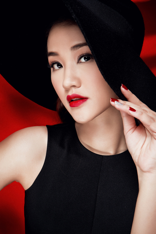 Màu son hồng đỏ dạng lì giúp Hoàng Thùy Linh trông chững chạc và quyến rũ hơn.