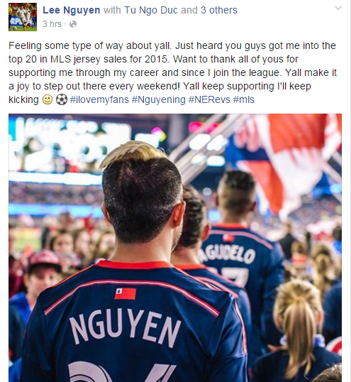 Đoạn status của Lee Nguyễn có thể tạm dịch như sau:“Đang cảm thấy rất khó tả về các bạn. Tôi vừa nghe thông tin mình lọt top 20 áo đấu bán chạy nhất giải MLS 2015. Tôi muốn cám ơn sự ủng hộ của các bạn trong suốt sự nghiệp của tôi và từ khi tôi chơi bóng ở đây. Các bạn đã làm tôi rất vui vào mỗi cuối tuần! Tiếp tục ủng hộ tôi nhé, tôi sẽ tiếp tục phấn đấu.”