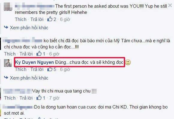 Trước những phát ngôn của Mỹ Tâm, MC Kỳ Duyên tỏ ra không quan tâm. Khi được fan hỏi nữ MC đã đọc về bài phỏng vấn của Mỹ Tâm, Kỳ Duyên thẳng thắn trả lời trên trang cá nhân: "Đúng... chưa đọc và sẽ không đọc".