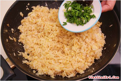 Bước 4: Sau đó cho cơm vào rang đều tay, thêm trứng, xì dầu, muối vừa ăn, đảo cho cơm săn lại. Cuối cùng rắc hành lá, đảo đều rồi cho cơm rang ra đĩa và thưởng thức!