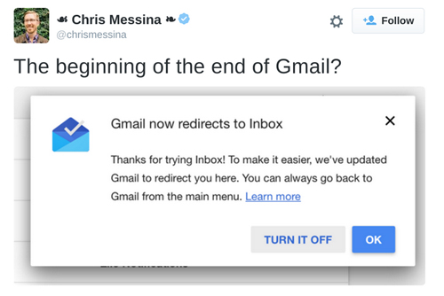 Khi truy cập Gmail.com, một số người đã được tự động chuyển hướng sang dịch vụ mới kèm theo thông báo có nội dung: "Gmail giờ đã chuyển sang Inbox". Google còn cho biết thêm: "Cảm ơn đã dùng thử Inbox! Để thuận tiện hơn, chúng tôi đã cập nhật để Gmail chuyển sang đây. Bạn có thể trở về Gmail bất cứ lúc nào từ menu chính".