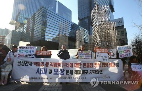 Các thành viên của nhóm Bảo vệ sức khỏe và nhân quyền của các công nhân sản xuất chất bán dẫn tổ chức họp báo gần trụ sở chính của tập đoàn Samsung tại Seoul ngày 13/1/2016 (Ảnh: Yonhap News)
