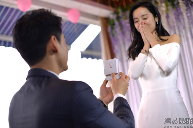 Tiền Vịnh Thần quỳ xuống cầu hôn Lữ Nhất với chiếc nhẫn kim cương 5 carat.
